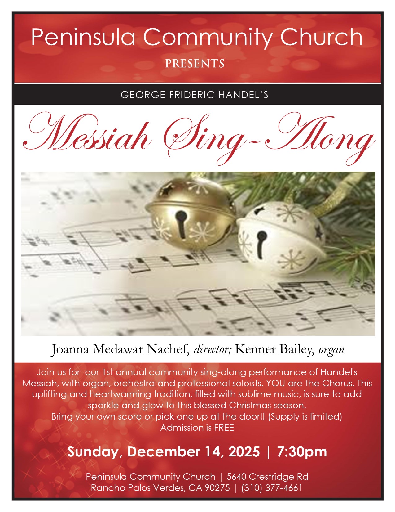 Join us for our Ist annual community sing-along performance of Handel’s Messiah, with organ, orchestra and professional soloists. YOU are the Chorus. This uplifting and heartwarming tradition, filled with sublime music, is sure to add sparkle and glow to this blessed Christmas season.